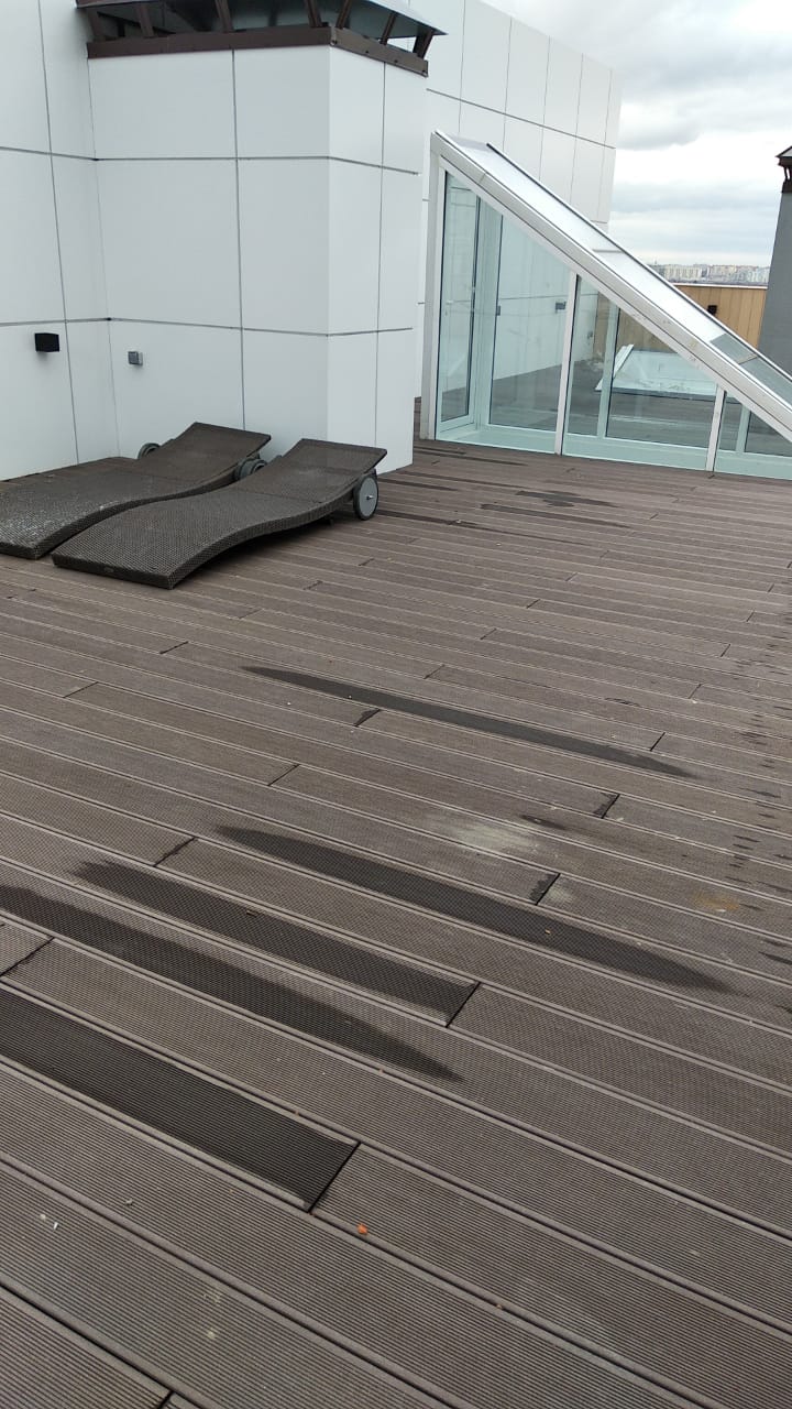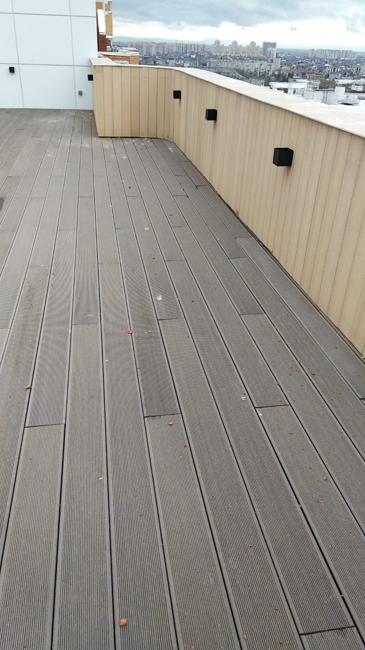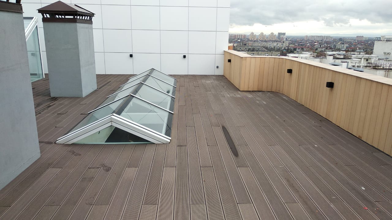 Краснодар, эксплуатируемая кровля, частное домовладение, декинг вельвет классик коричневый, сайдинг винтаж натуральный